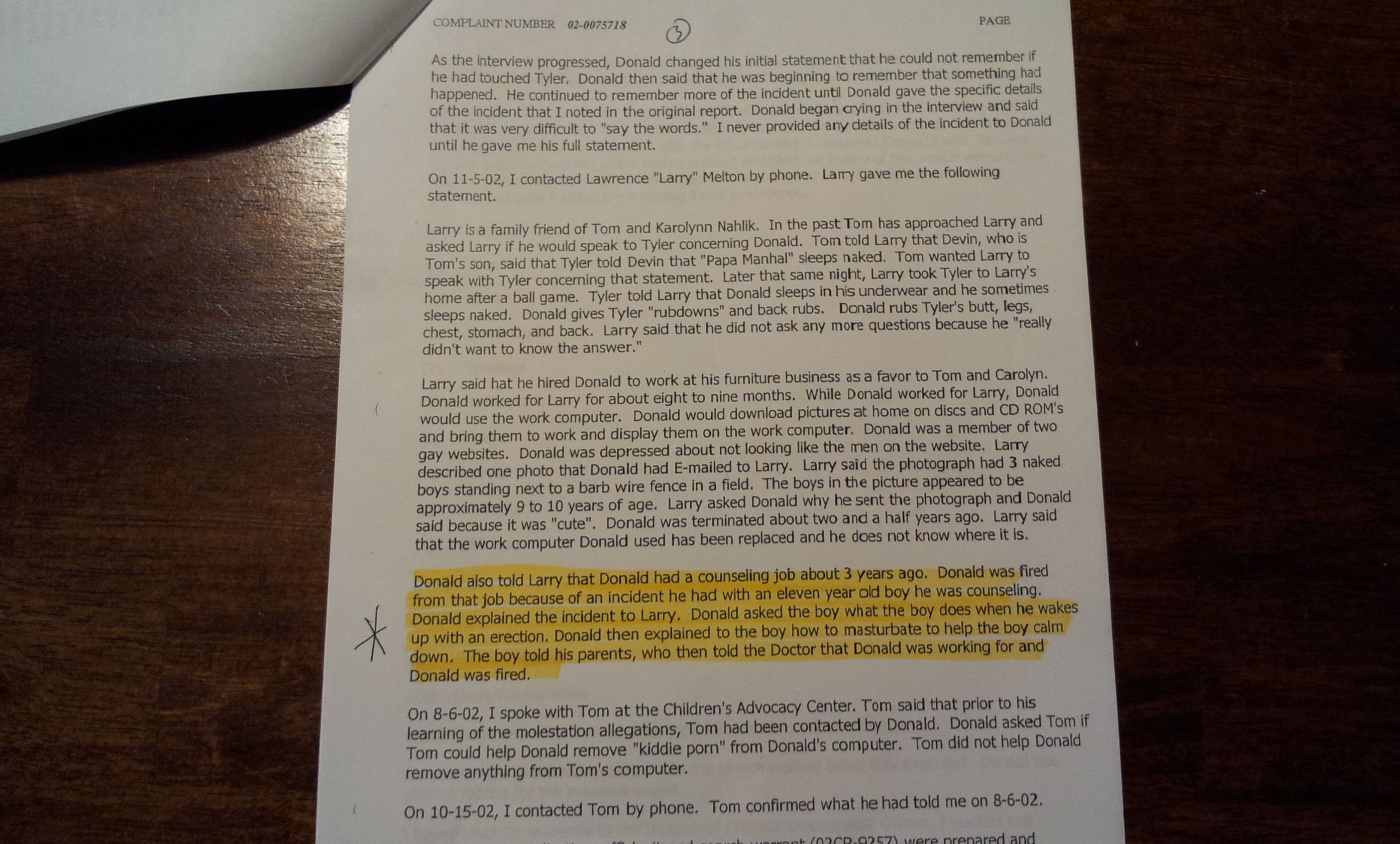 Don Manhal was finally asked to resign from the DFS agency because of various incidents with young boys. One of Don Manhals co-workers had also reported that Don Manhal had asked him to come to his house and help him with his personal computer. When his co-worker arrived and started working on his pc, he reported that he had witnessed kiddie porn on Don Manhal’s pc.